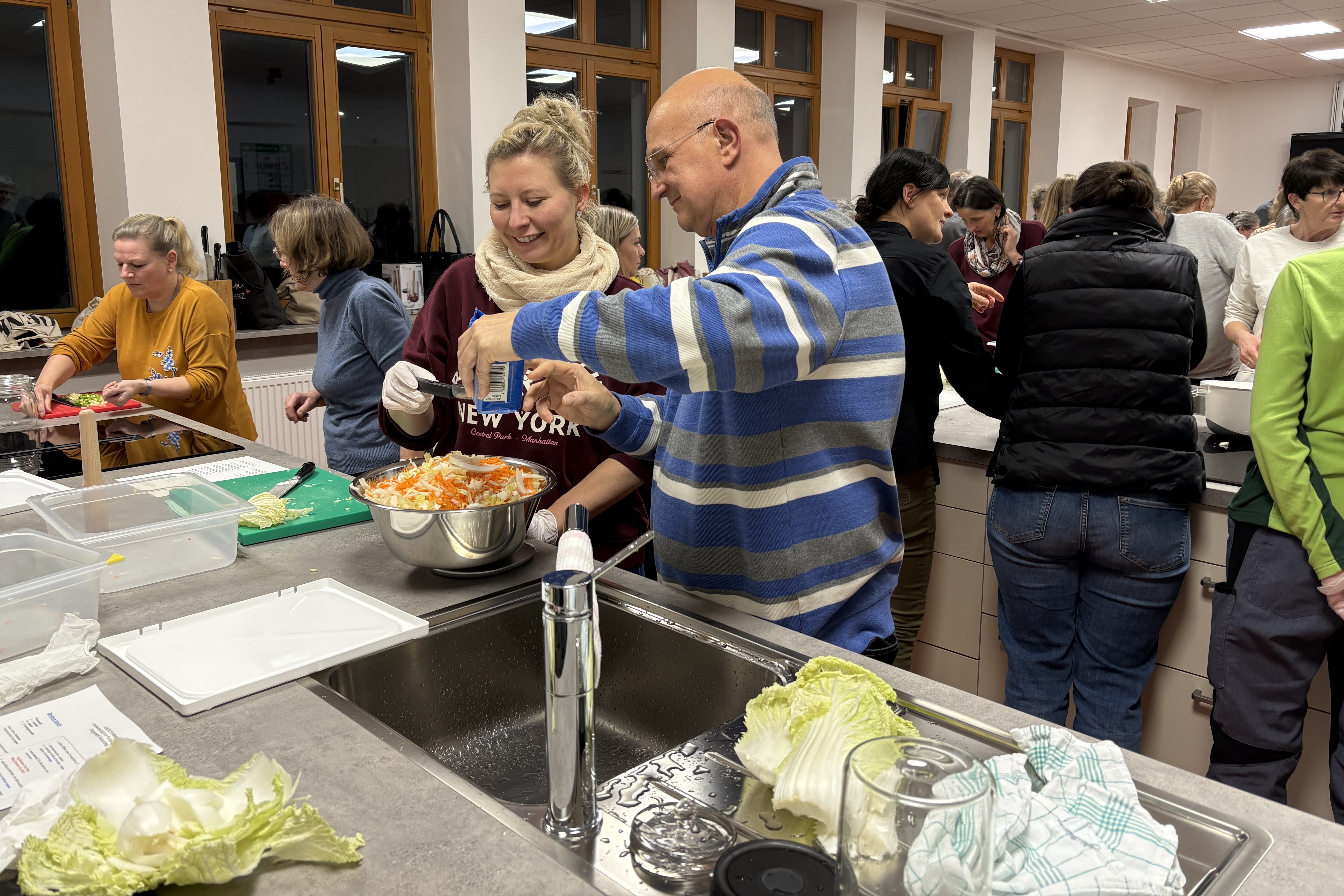 Der Andrang war groß für den Kurs zur Ernährungsnotfallvorsorge, dem Haltbarmachen von Lebensmitteln und Fermentieren. 38 Männer und Frauen informierten sich, schnippelten jede Menge Gemüse und setzten Kimchi an.